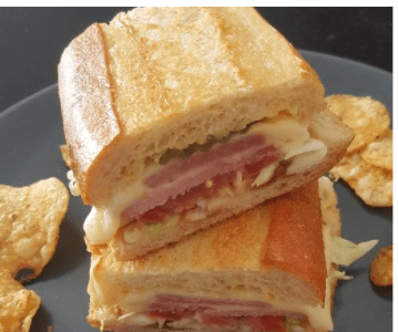 Sandwich jambon fumé et fromage. Chou râpé et tomates. Moutarde, cornichons, mayo vegan et fromage. Aïoli Ajilimojili et vinaigrette F.B Papalaguy Adereso. Servi sur pan-criollo grillé. Ingrédients : Jambon fumee, chou, tomates, pickles, mayo vegan, moutarde, fromage, ajilimojili aïoli, et Vinagrette Portorcain F.B. Papalaguy Adereso. Présenté sur Pan Boricua fait maison.