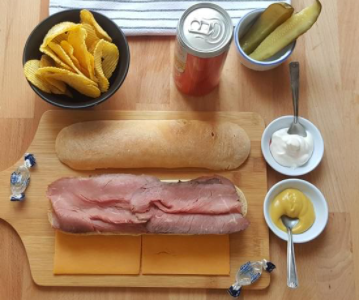 Rosbif mi- saignant tranché façon New York Deli style (wafer thin cut) étalé sur une baguette de pain de Agua Porto Ricain. Servi simple, avec choix de moutarde américaine deli et cornichons ou raifort végétalien. Tranche de cornichon en accompagnement. Fromage cheddar en option. Grillé sur demande.