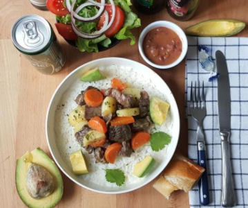 Puerto Rican one-pot, slow cooked stew, with beef, carrots and potatoes. Served over fluffy white rice with small red beans in sofrito tomato sauce. Avocado and green salad are optional.
