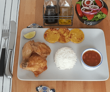 Yellow plantains (amarillos). Side green salad. Avocdo optional (subject to availability)
