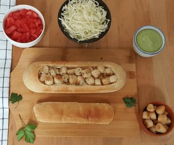 Bocaditos de vieiras fritas en una baguette puertorriqueña Pan de Agua cortada en forma de Canoa Taino.