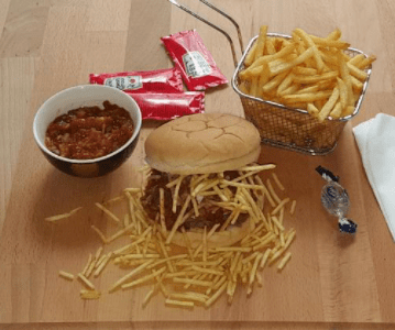 Ingredients: Beef and pork seasoned with Latin adobo (salt, garlic powder, oregano, cumin, spices) confit of onions made with sofrito, matchstick fries served on a soft Cubano-style burger bun.