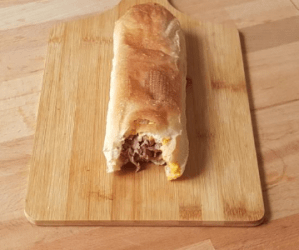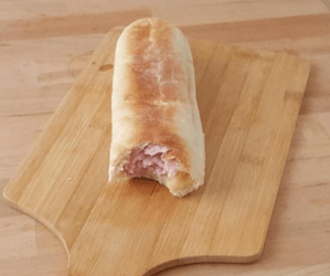 We then roll up the charcuterie/cheese set and slide this set horizontally into the hollowed-out baguette. The sandwich can then be reheated in the oven to bring together the internal ingredients, or it can be eaten cold, as is.