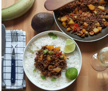 Versión vegana del icónico plato cubano. Compuesto a base de proteína vegetal de Beyond Meat. Servido sobre arroz blanco